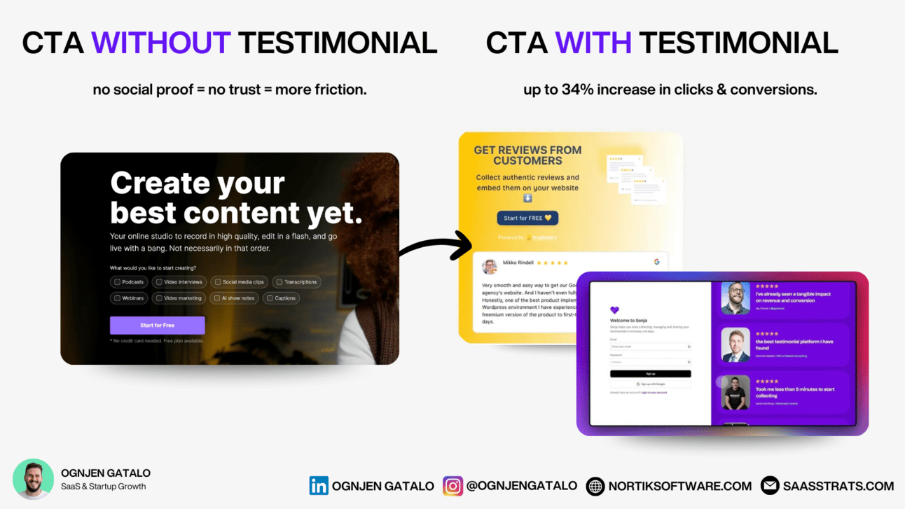 Strategically placing testimonials near CTAs is proven to lead to a 34% uplift in clicks & conversions. (Source: Faster Capital)